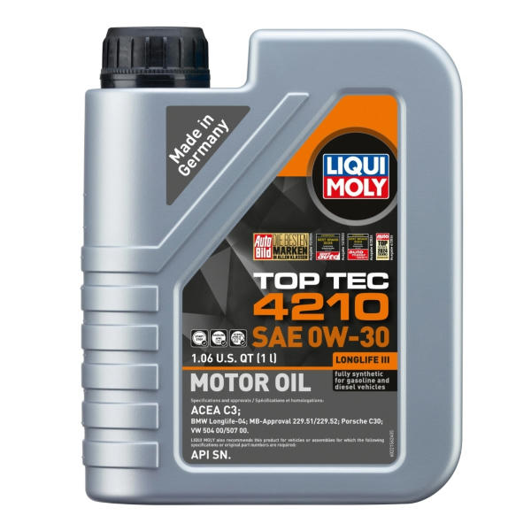 - Úžitkové čísla: 0W-30, ACEA C3, API SN, BMW Longlife-04, Iveco 18-1811 SC1 LV 21, MB-Freigabe 229.51/229.52, P005106, Porsche C30, Top Tec 4210 0W-30, VW 504 00/507 00